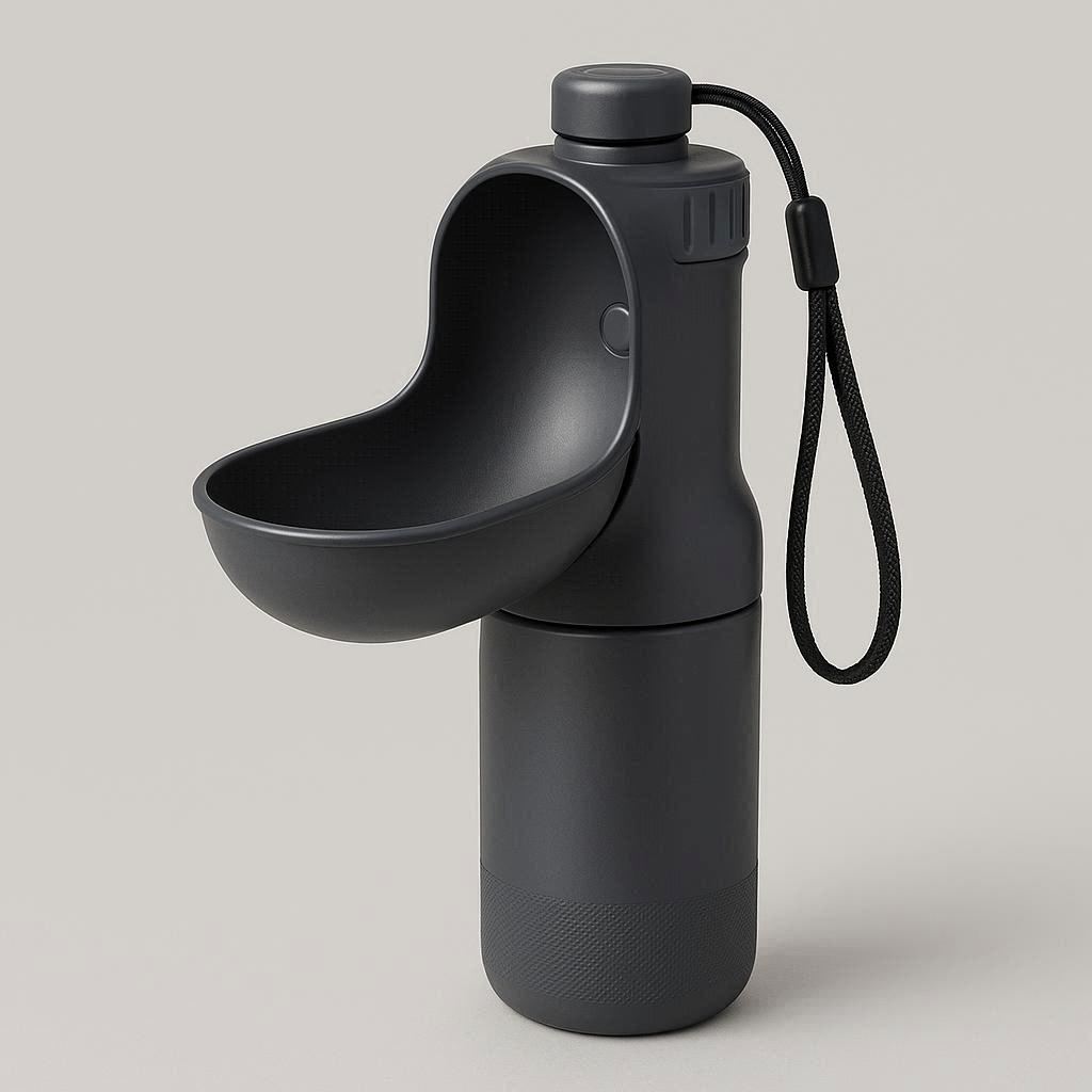 A compact and durable portable water bottle for dogs, featuring an integrated bowl for easy access to water. Ideal for outdoor adventures, ensuring your pet stays hydrated without spills.